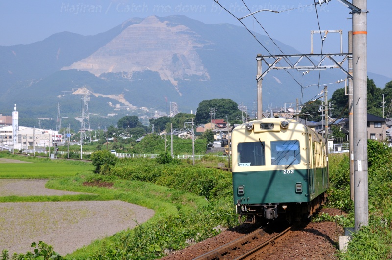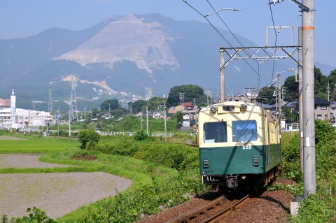 阿下喜駅を出発した西桑名行の上り列車は、しばらく水田の中を進み、やがて斜面に沿って緩くカーブしながら麻生田(おうだ)駅への登り坂に差し掛かります。ちょうどその辺りで、石灰石の採石で白い山肌を見せる藤原岳をバックに写真を撮ることができました。