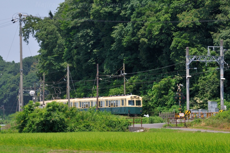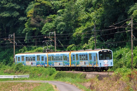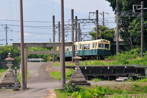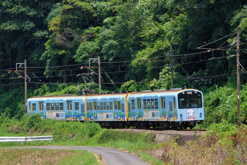 同じ編成が阿下喜駅から折り返すところを八幡神社前で待ちました。この場所は半径80mの曲線区間で、列車は車輪を軋ませて通過します。