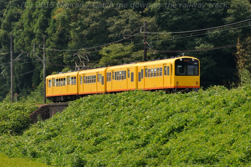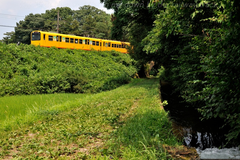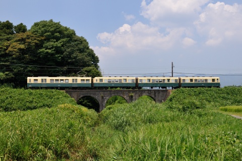 編成のうち後ろ(写真右側)の3両(サハ201+サハ101+クハ202)は、三重交通が新造した3両編成の連接車です。長さ19.8mのコンクリートブロック製3連アーチ橋である明智川拱橋を渡る電車の、連接台車の様子がよく見えます。