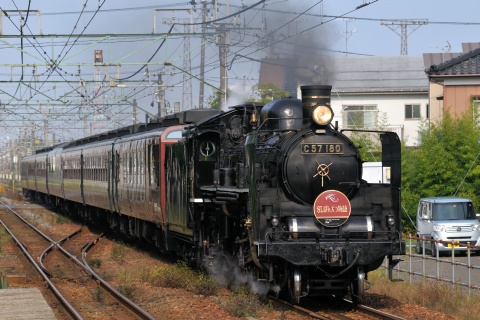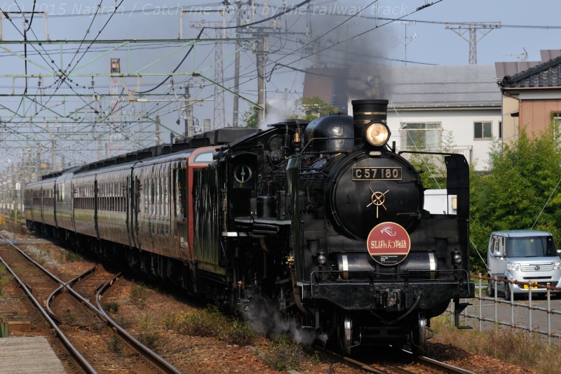 △ SLばんえつ物語、越後石山駅通過、C57180ほか [2015.10, 越後石山駅, 新潟県新潟市]