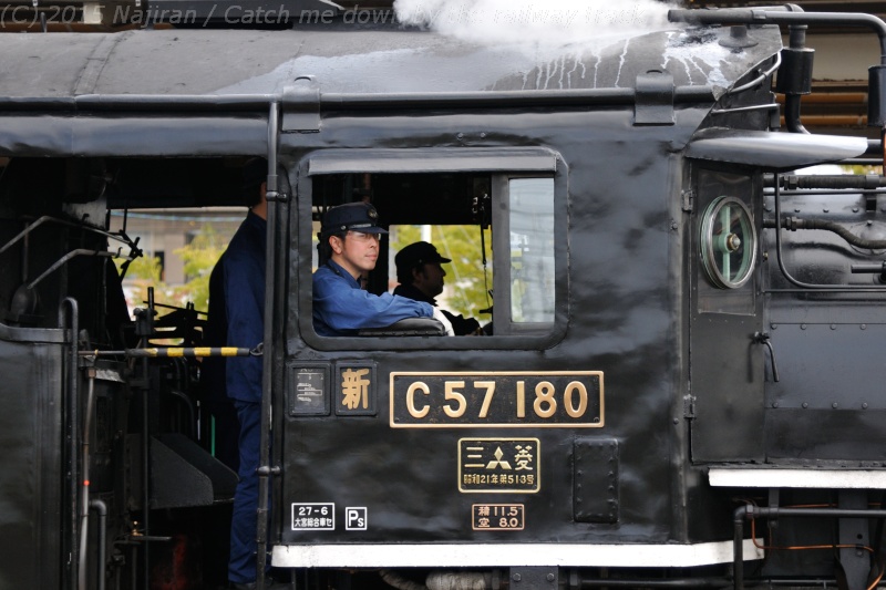 △ 新津駅停車中のSLばんえつ物語、牽引機のC57180の運転席 [2015.10, 新津駅, 新潟県新潟市]