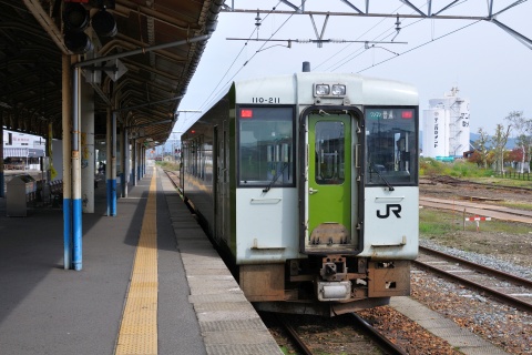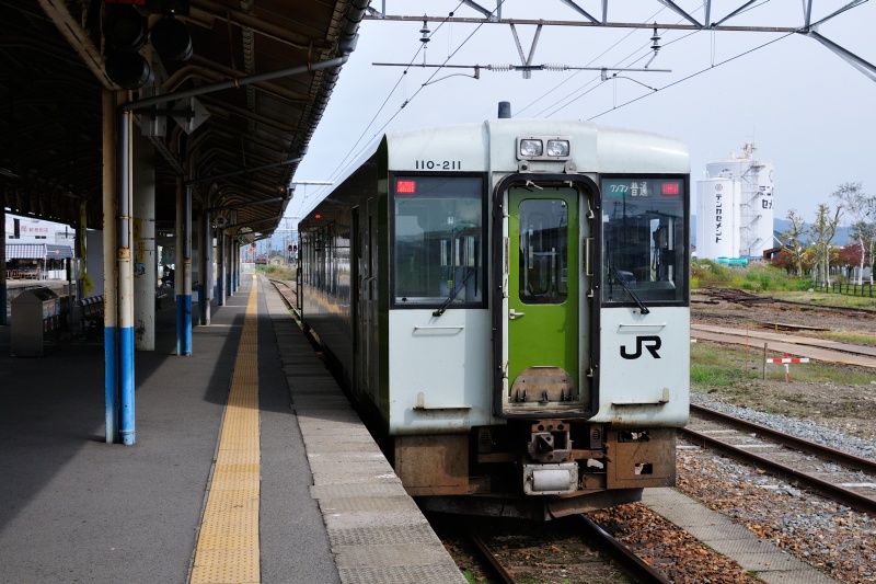 区間列車が停車しているのは駅舎とは反対側にある島式ホームの3番線で、その右側に側線があります。車両の後ろに見えているのは電気化学工業新発田サービスステーションで、以前はここまで専用線が伸びていてセメント貨物の到着がありました。また、電気化学専用線が分れていたもっと先からは、廃止された赤谷線が分岐していました。