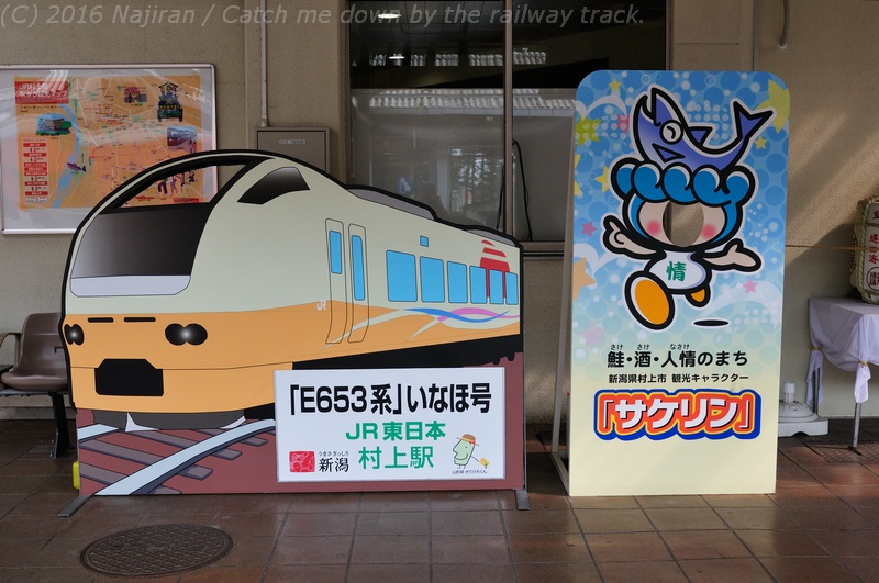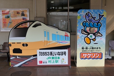 サケリンの隣にあるのは、日本海と稲穂をモチーフに新塗装で運行を始めたE653系いなほ号のボードです。