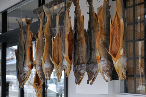 村上には100種類を超える鮭の料理法があると聞きます。その代表が塩を引いた鮭を寒風にさらして作る塩引き鮭で、日本酒との相性は抜群です。