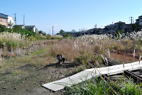 操車場には線路や車止めが残されていますが、背の高いススキに覆われていました。