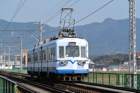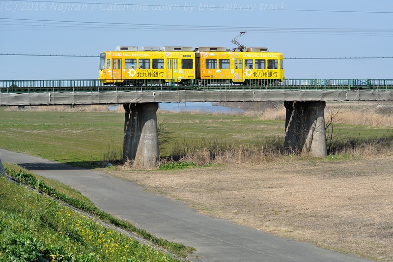 古参の2000形が長い鉄橋を渡り筑豊直方駅に向かいます。