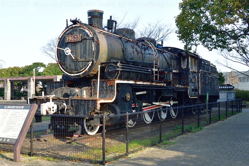 操車場の跡につくられた久岐の浜広場には、「若松駅操車場跡」と書かれた石碑があり、国鉄時代に若松駅が日本一の貨物取扱駅操車場だったことなどが書かれています。 久岐の浜広場には、かつて若松機関区で活躍した蒸気機関車19633が保存されていますが、残念なことに状態は良くありません。
