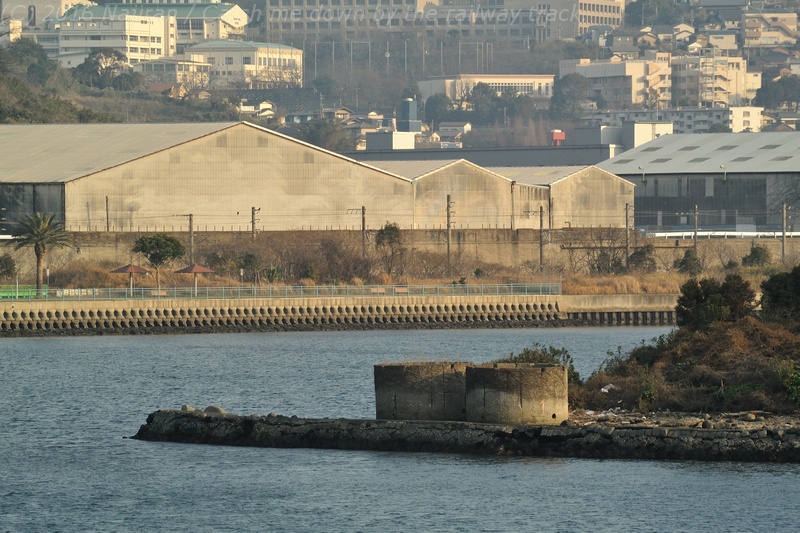 駅前から少し歩くと、かつての操車場跡には高層住宅が立ち並んでいますが、そのすぐ横はもう洞海湾です。若戸大橋の赤い筐体が夕日に照らされてきれいでした。洞海湾の対岸には鹿児島本線が通っていて、長いコンテナ列車が走っていきました。