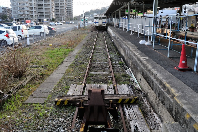 若松駅1番線に停車中の折尾行列車を、車止越しに撮ってみました。1番線には、客車列車が運転されていた頃に使われた機回し線が残っています。