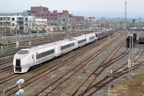 まずは構内に架かる歩道橋に上り、全体の様子を見渡しました。写真は東日本大震災後から構内に留置されている、651系(勝田車両センターK202編成)と415系(K534編成)です。