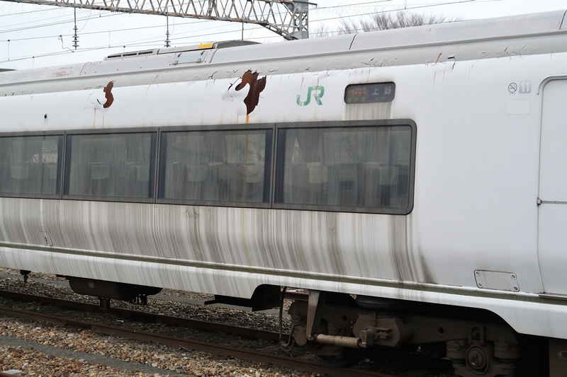 白い車体なので、なおさら塗装の剥離や水垢が目立ちます。