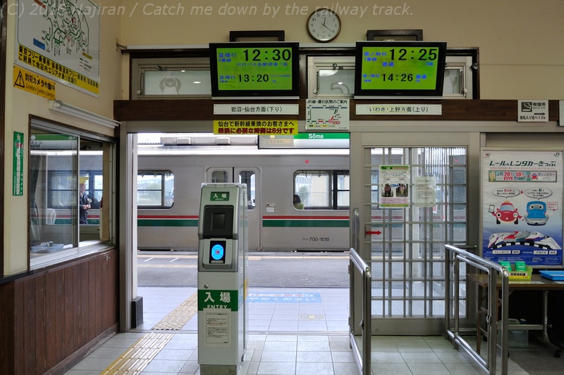 相馬駅の列車案内表示器には、仙台・岩沼方面は亘理行代行バスの時刻が、いわき・上野方面は次の原ノ町行普通電車の時刻が、それぞれ表示されていました。