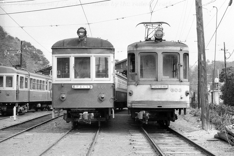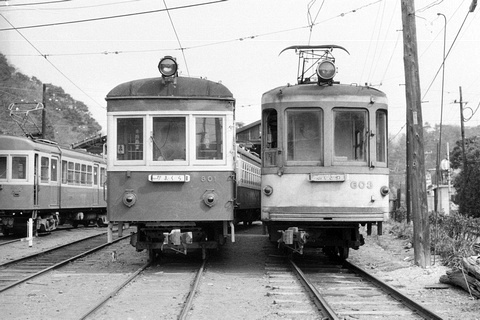 正面を向いて2編成並んだ左側の801は、山梨交通モハ7形→上田丸子電鉄(上田交通)モハ2340形→江の島鎌倉観光で、1986年に廃車されるまで使われ、現在は山梨県南巨摩郡富士川町利根川公園に静態保存されています。また、右側の603は、東急の玉川線廃止で余剰となったデハ80形4両を譲り受けて改造した内の1両で、1983年に廃止されるまで使われました。