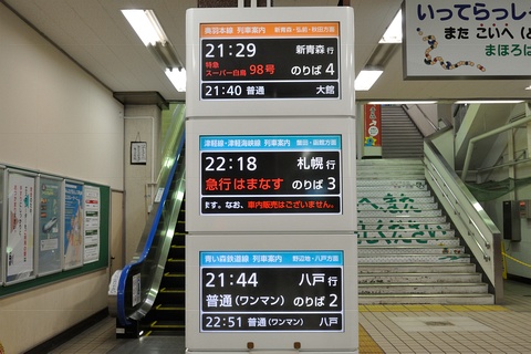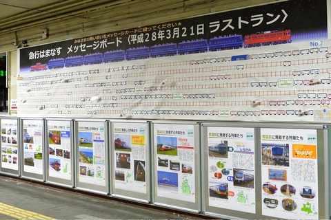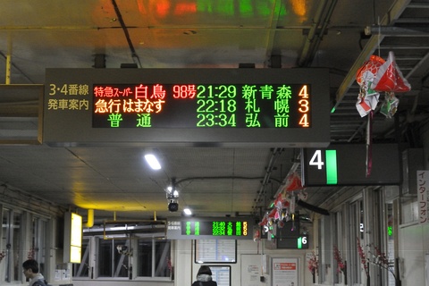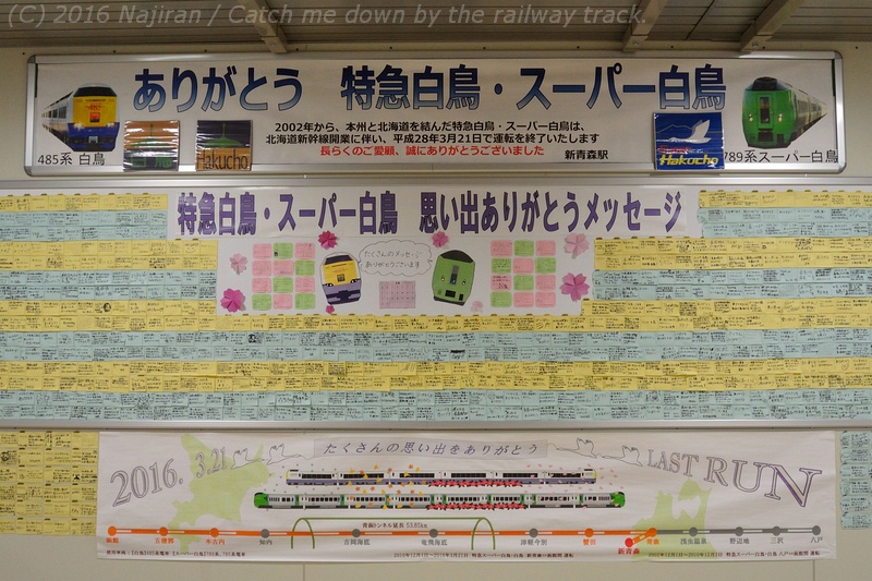青森へは、花輪線、奥羽本線経由でのアプローチでした。はまなすの発車まで少し時間があったので、大鰐温泉駅前の「鰐come(わにかむ)」でひと風呂浴びようかと迷っているうちに降りそこなってしまい、けっきょく新青森駅の構内で夕食と明日の食糧調達をすませることにしました。新青森駅の改札脇には、同じくダイヤ改正で廃止される新青森-函館間の特急「白鳥」と「スーパー白鳥」への想いを利用者が綴ったメッセージボードが掲示されていました。