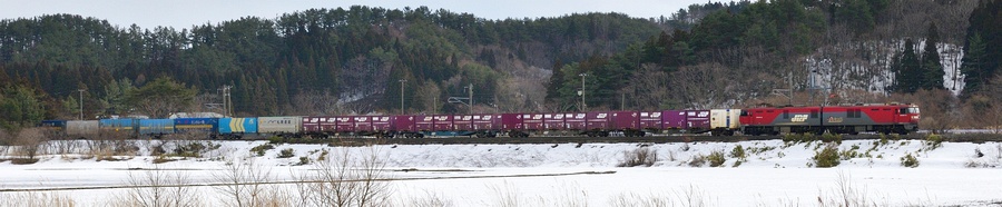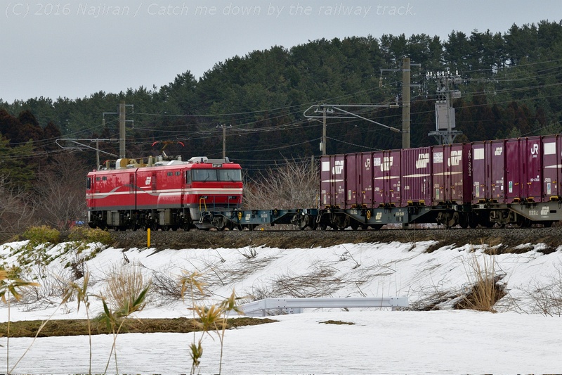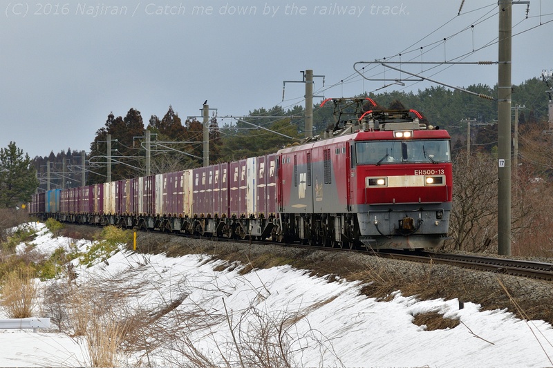 バナーは、EH500-32が牽引する3051レ、隅田川貨物駅発、札幌貨物ターミナル駅行の高速貨物列車です。[2016.03, 蟹田-中小国、青森県東津軽郡外ヶ浜町]
