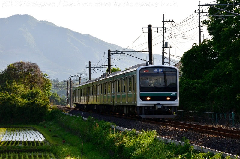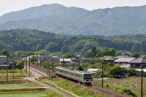 △ 加波山をバックに稲田駅に向かう755M、クハE501-1001 (K751編成)。 [2016.05, 福原-稲田、茨城県笠間市]