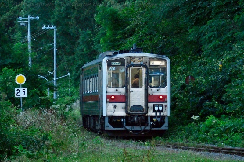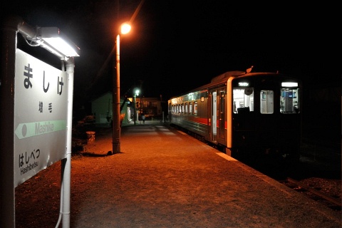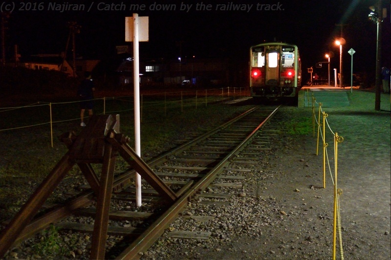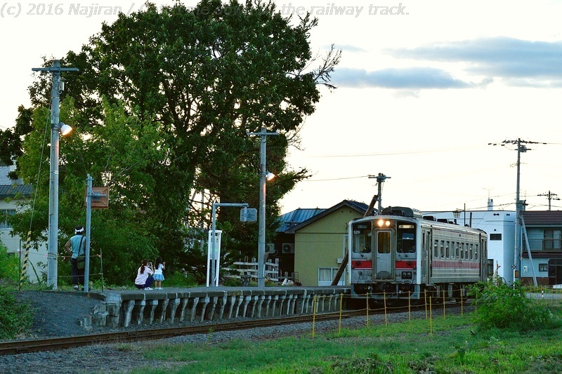 廃止が決まっているせいか、増毛まで乗ってきてそのまま折り返す鉄道ファンが結構いましたが、発車直前の駅のホームに残ったのは、写真を撮る親子と地元の写真家と思しき方が1名。気動車のアイドリングの音が響く駅に、夕陽が静かに木漏れ日を落とします。
