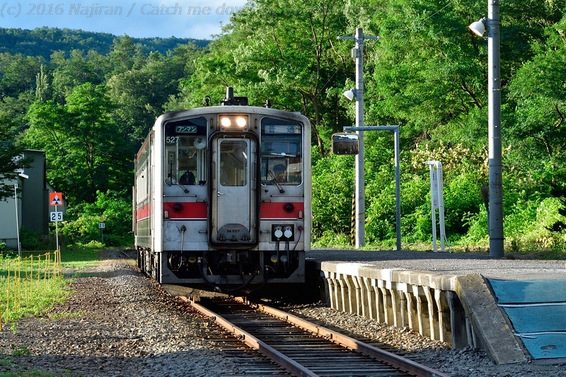 △ 留萌からの回送列車 回5923D が到着。キハ 54527。[2016.08、増毛駅、北海道増毛郡増毛町]