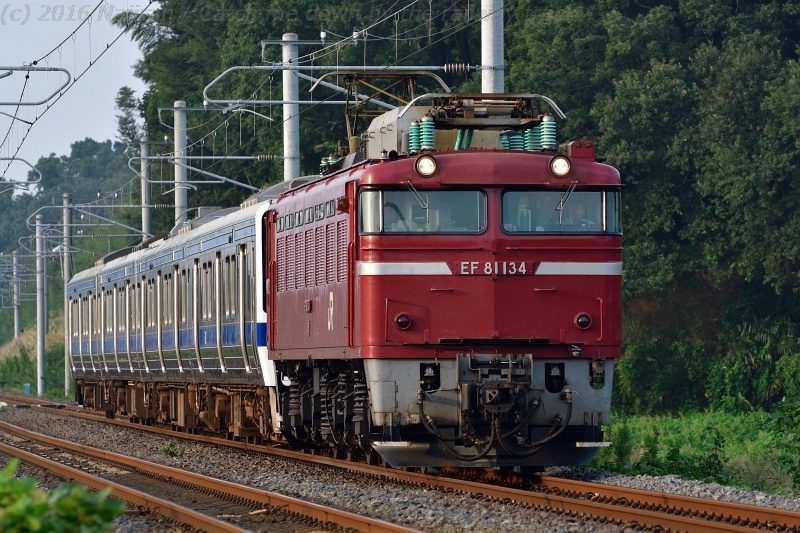 △ 常磐線 配9496レ、EF81134(長岡)+K537(勝田)編成 (クハ411-1627+モハ414-1527+モハ415-1527+クハ415-1527)。[2016.09、牛久-佐貫、茨城県牛久市]