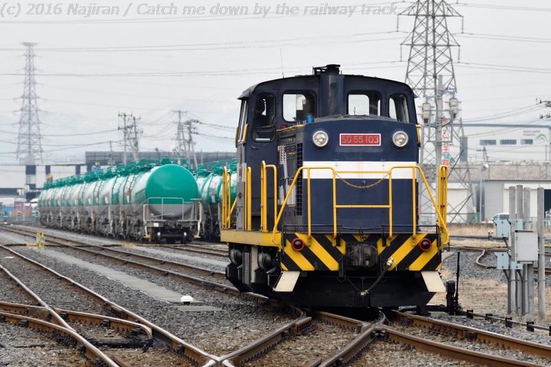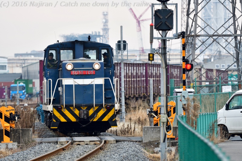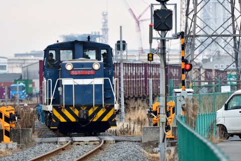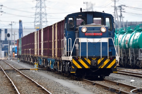 SD55形ディーゼル機関車は新潟鐵工所製の自社発注機で、震災前は 101~103 の3両が在籍しましたが、災害で101号機と102号機が廃車になっています。一方、SD55105は 震災後の2012年に京葉臨海鉄道から譲渡されたた機関車で、京葉臨海鉄道当時の型番は KD55105です。2017年1月現在、仙台臨海鉄道にはSD55103、SD55105の2台のSD55形ディーゼル機関車が在籍し、さらに秋田臨港鉄道から借り入れたDE652を加えた3両の体制で輸送を行っています。