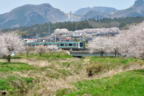 小山行の電車が笠間駅を発車してすぐに涸沼川の鉄橋を渡ります。その辺り、涸沼川の堤に地元の方々が整備された「夢千本桜」がきれいに咲いていました。