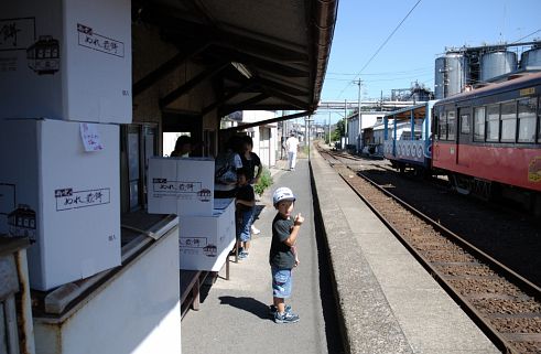 △ 仲ノ町駅のホームに積まれた「ぬれ煎餅」のダンボール。 (2007.09)