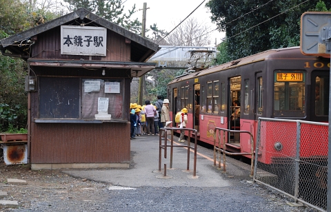 本銚子駅は始点の銚子駅から数えて3つ目にある。無人駅ではあるが、駅の北側には古くからの銚子市街地が広がる。近くに小学校があり、銚子電鉄は生徒の通学の足にもなっている。