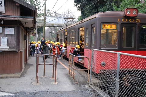 △ 本銚子駅に到着したデハ1002、外川行きの下り電車。 (2006.12)