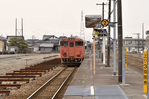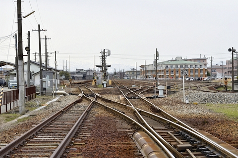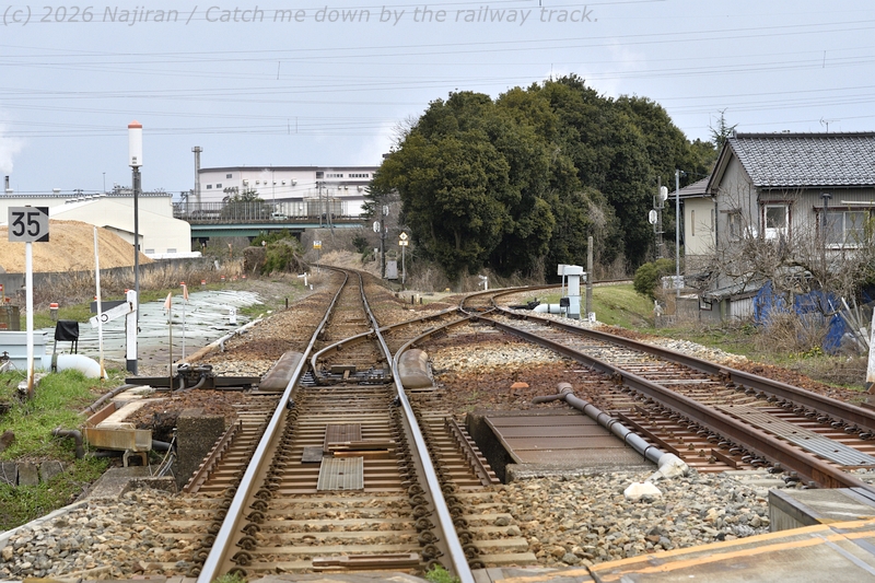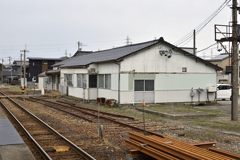 雨晴海岸からの帰りは、能町駅で万葉線に乗り換えて高岡駅に向かいました。 能町駅は木造の駅舎がある氷見線の駅で、高岡貨物駅に至る新湊線(貨物線)が分岐します。 一面二線の交換可能駅で、以前は日本曹達や中越パルプを中心にかなりの量の荷扱いがありました。 現在は貨物の取り扱いは中止されており、上り側の側線はすべて撤去、下り側の側線は下1番線を除き錆が浮かんだ状態でした。
