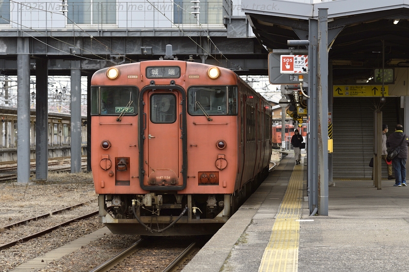 △ 城端線 337D 城端行。キハ47 1134+キハ47 138、高岡駅。[2026-03、富山県高岡市]