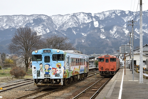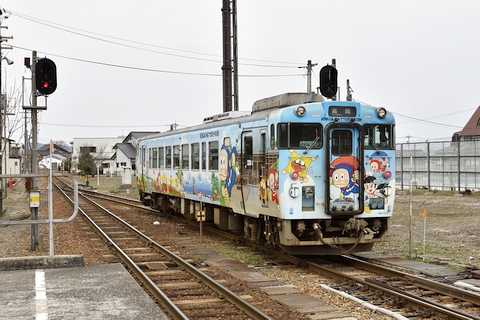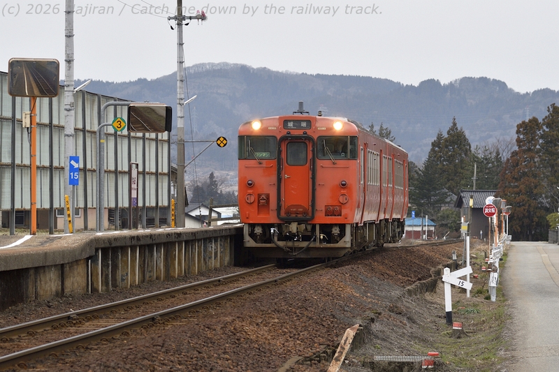 △ 城端線 343D 城端行。キハ47 1091+キハ47 42、越中山田駅。[2026-03、富山県南砺市]
