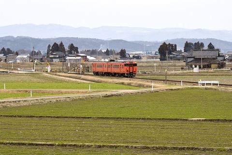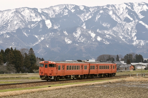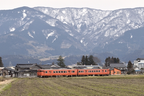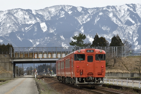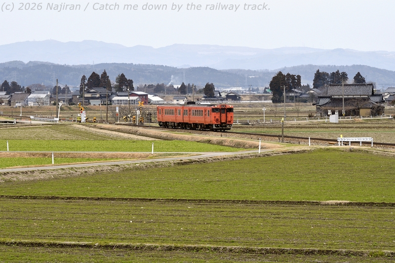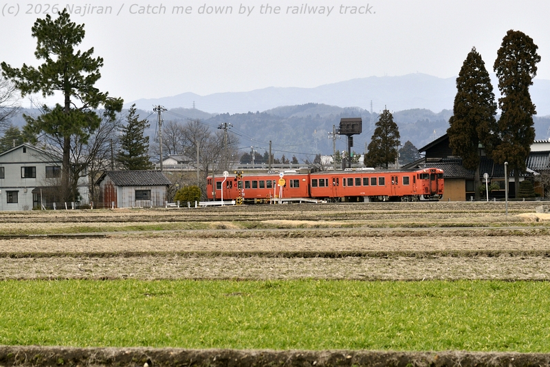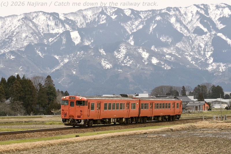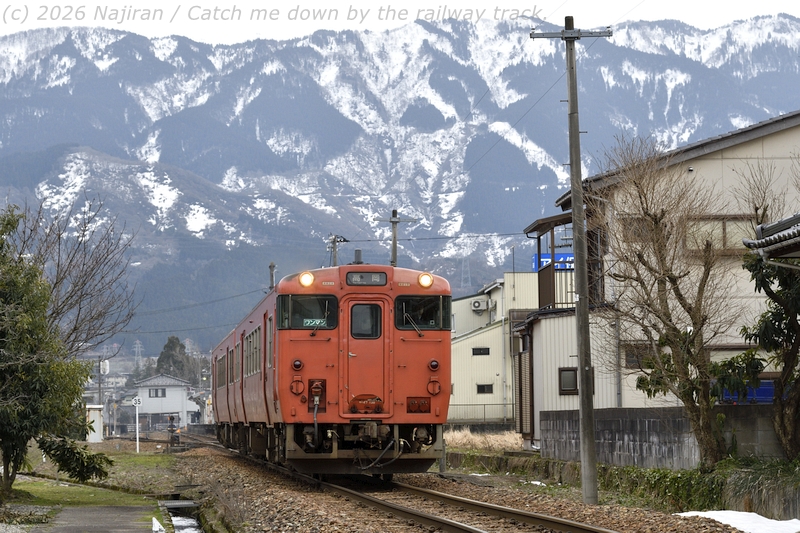 △ 城端線 343D 高岡行。キハ47 1091+キハ47 42(後追い)、越中山田-城端。[2026-03、富山県南砺市]