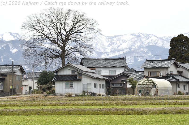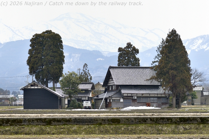 無人駅のホームの向こうには、残雪の医王山方面の山々が望めます。