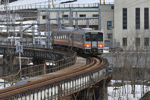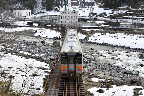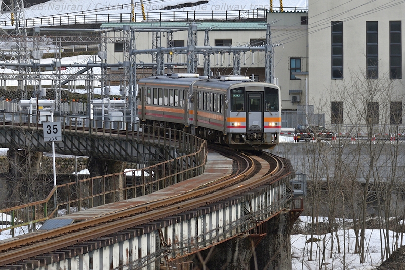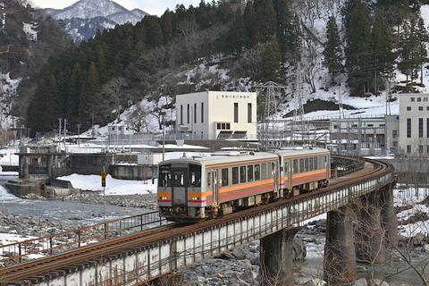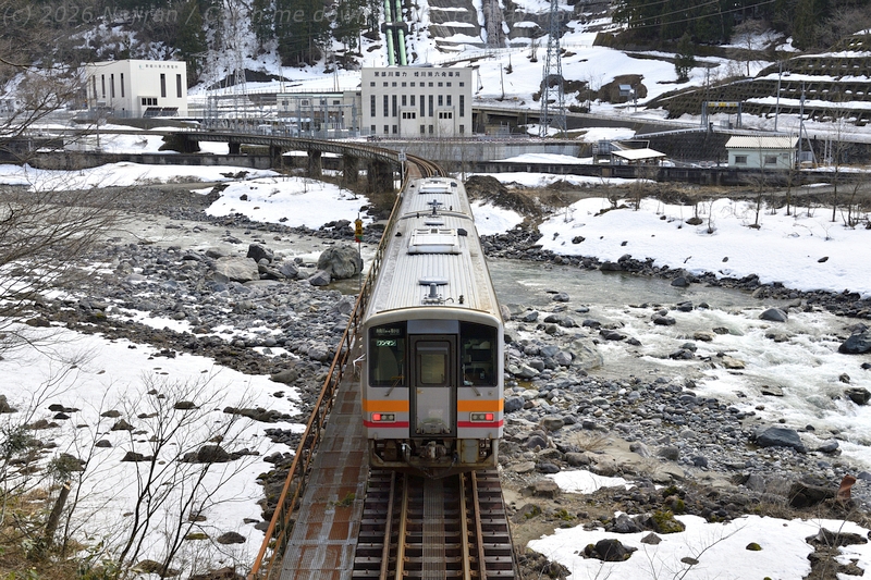 △ 大糸線 430D 南小谷行。キハ120 341 + キハ120 354(後追い)、根知-小滝。[2026-03、新潟県糸魚川市]