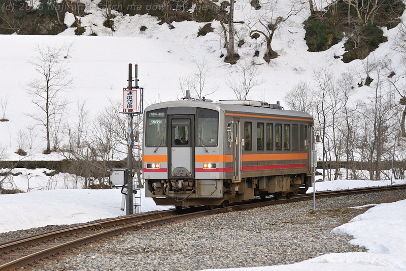 △ 大糸線 432D 南小谷行。キハ120 329(後追い)、根知-小滝。[2026-03、新潟県糸魚川市]