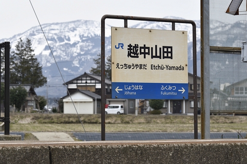 無人駅のホームの向こうには、残雪の医王山方面の山々が望めます。
