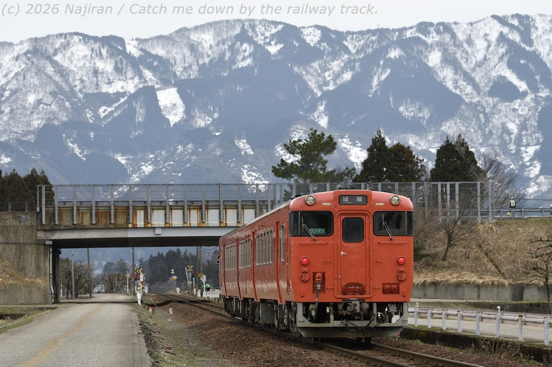 △ 城端線 343D 高岡行。キハ47 1091+キハ47 42(後追い)、越中山田-城端。[2026-03、富山県南砺市]