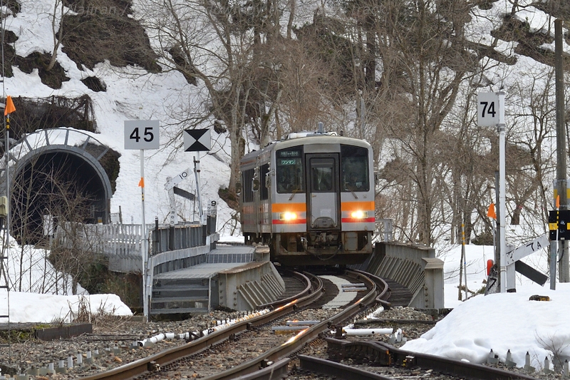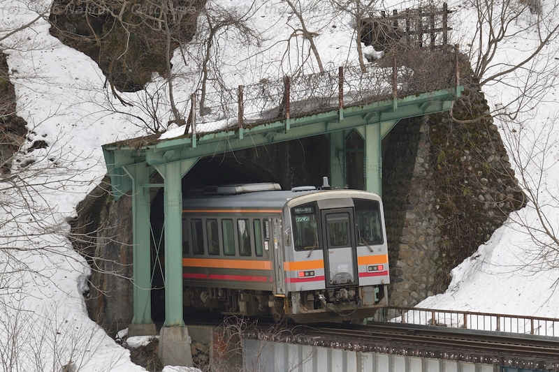 第5姫川橋梁から滝ノ口トンネルに入る上り列車を後追いで。